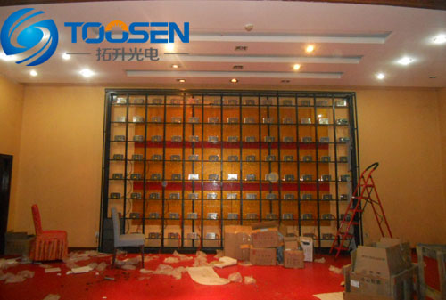 P6室内全彩LED显示屏是固定安装在内蒙古乌海市湖南会馆酒店内部,主要用来在酒店举行婚庆做背景使用。上图为前期施工和安装现场,从图片上看P6室内全彩LED显示屏钢结构基本上目前已经焊接施工完毕。电源也都已经全部固定在钢结构的方通上,为了能让电源更安全的供电,全部采用用螺丝固定。然后就是要连接好电源与模组间的电源线,为了提高电源更稳定的供电,选择一个电源给8个模组供电。接下来就是要进行P6室内全彩LED显示屏模组拼接。